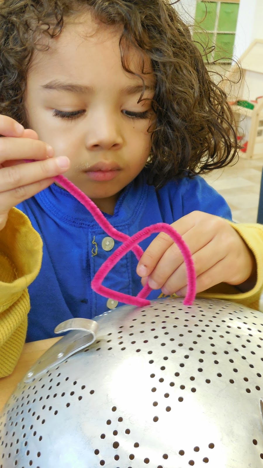 | Focusing as I try to put this pipe cleaner through the hole in the colander. |